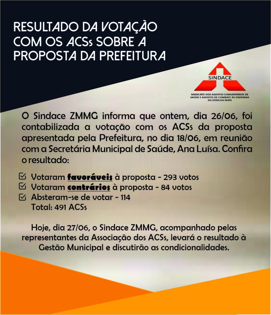 O Sindace ZMMG informa que ontem, dia 26/06, foi contabilizada a votação com os ACSs da proposta apresentada pela Prefeitura, no dia 18/06, em reunião com a Secretária Municipal de Saúde, Ana Luísa. Confira o resultado: