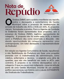 O Sindace ZMMG vem a público manifestar seu repúdio contra o desrespeito e autoritarismo da Gestão Municipal sobre a proposta de readequação da jornada de trabalho dos ACSs e ACEs em 30hs. As propostas vieram formatadas e prontas. Para os Agentes de Combate às Endemias foram apresentadas duas propostas, sem a presença do Sindace ZMMG, legítimo representante da categoria. A proposta não foi aceita pelos ACEs, e mesmo assim a Prefeitura deu como encerrada a discussão não dando oportunidade da categoria apresentar uma contraproposta. Um total desrespeito à representatividade do Sindicato!